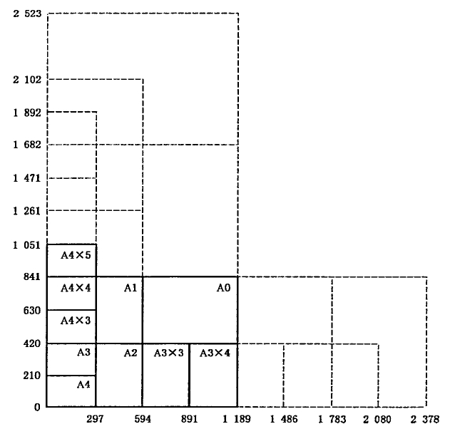 2 必要时, 也允许选用表 2 和表 3 所规定的加长幅面。这些幅面的尺寸是由基本幅面的短边成整数倍增加后得出, 如图 1 所示。