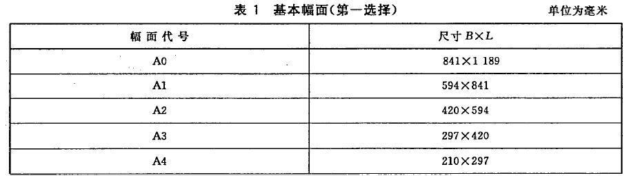 1. 绘制技术图样时, 应优先采用表 1 所规定的基本幅面。概念: 图纸宽度与长度组成的图面。为了合理利用图纸和便于图样管理, 国家标准规定了 5 种标准图纸的幅面, 其代号分别为 A0,A1,A2,A3,A4。绘图时, 应优先选用国家标准规定的幅面尺寸, 见表 1
