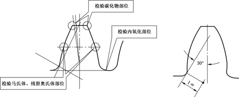 马氏体级别 | 在距表面0.05mm~0.15mm 处进行检验,齿形试样应在齿宽中部节圆部位的法向截面处进行检验 |